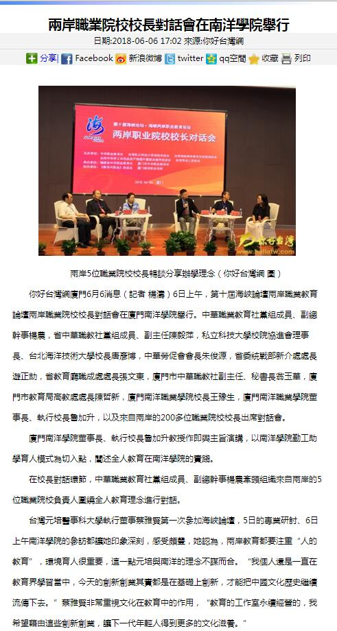 你好台灣網廈門 6月6消息(記者 楊濤)6日上午,第十屆海峽論壇兩岸職業教育論壇兩岸職業院校校長對話會在廈門南洋學院舉行。中華職業教育社黨組成員、副總幹事楊農,省中華職教社黨組成員、副主任陳毅萍,私立科技大學校院協進會理事長、台北海洋技術大學校長唐彥博,中華勞促會會長朱俊源,省委統戰部新介處處長遊正劼,省教育廳職成處處長張文東,廈門市中華職教社副主任、秘書長翁玉華,廈門市教育局高教處處長陳哲新,廈門南洋職業學院校長王豫生,廈門南洋職業學院董事長、執行校長魯加升,以及來自兩岸的200多位職業院校校長出席對話會。