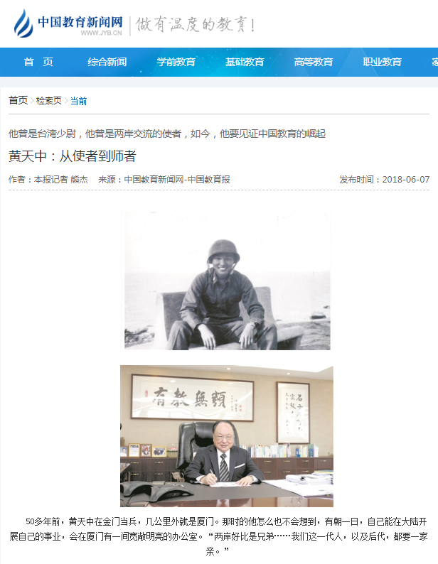 编者按:2018年6月7日出版的《中国教育报》第四版用整版的篇幅报道厦门南洋学院校董黄天中校长在大陆办教育、见证中国高等教育在世界中崛起的事迹。文章重点讲述了黄天中校长潜心研究职业生涯教育,希望帮助学生明确人生规划,少走弯路,“为祖国高等教育尽一份力”的梦想和实践。
