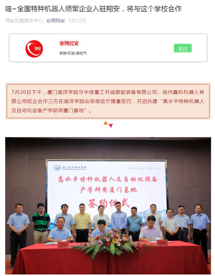 7月20日下午,厦门南洋学院与中信重工开诚智能装备有限公司、徐州鑫科机器人有限公司校企合作三方在南洋学院仙岳报告厅隆重签约,开启共建“高水平特种机器人及自动化设备产学研用厦门基地”。