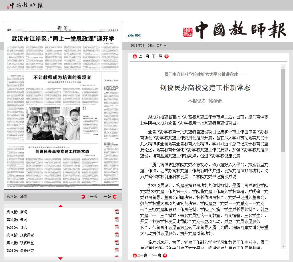 创设学工微信平台,让党建时刻在线。2013年9月,学院创设党委学工微信平台,让思政教育“即时通”、学生管理“接地气”、党群交流“心连心”、大小会议“无纸化”,荣获教育部思政司“全国民办高校党建和思政工作优秀成果特等奖”。创建公寓党工委,让党建“走进”学生宿舍。2014年3月,成立公寓党工委,下设6个楼栋党支部,形成“一个工委,六个阵地”“一种身份,五个角色”“一票否决,四项考核”等公寓党建特色,让党建“走进”学生公寓的研究论文荣获“全国民办高校党建和思政工作优秀论文一等奖”。创立党委教师工作部,让党建引领教师发展。2017年5月,在福建省高校首家成立党委教师工作部,把培养“四有”好教师作为首要任务。修订《教师手册》、出台《师德师风负面清单和失范行为处理办法》,开展“最美教师”和“南洋学者”遴选,组织青年教师参加国家教育行政学院师德师风专题网络培训、制定红专发展规划、“重走习近平总书记走过的路”等活动,引领教师成为学生的“四个引路人”,相关做法得到教育部思政司高度肯定。创新红色教育平台,让党建传承红色基因。开展“红色基因,我们传承”系列活动,入选厦门高校“三爱”主题教育活动十大重点扶持项目。通过红色足迹“走”起来、红色精神“请”进来、红色历史“说”起来、红色故事“讲”起来、红色主旋律“唱”起来等形式,让党建思政传承红色基因。创建勤工助学平台,让党建提升育人成效。学校率先在厦门高校中成立勤工助学服务中心,将勤工助学纳入学生素质拓展学分,达到“济困”和“育人”双重功效。创建省级文明校园,让党建提升立德树人水平。以省级文明校园创建为契机,将文明创建融入学校中心工作、融入校园环境美化、融入学校课堂教学与实践、融入校园文化与社会服务,持续推进生态学校建设。2018年,学校成为厦门市民办高校中唯一的首届高校省级文明校园。