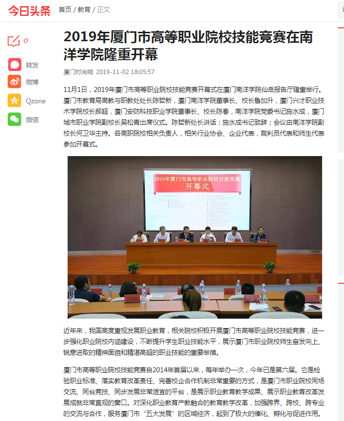 11月1日,2019年厦门市高等职业院校技能竞赛开幕式在厦门南洋学院仙岳报告厅隆重举行。厦门市教育局高教与职教处处长陈哲新,厦门南洋学院董事长、校长鲁加升,厦门兴才职业技术学院校长郝超,厦门安防科技职业学院董事长、校长陈春,南洋学院党委书记施水成,厦门城市职业学院副校长吴松青出席仪式。陈哲新处长讲话;施水成书记致辞;会议由南洋学院副校长何卫华主持。各高职院校相关负责人,相关行业协会、企业代表,裁判员代表和师生代表参加开幕式。