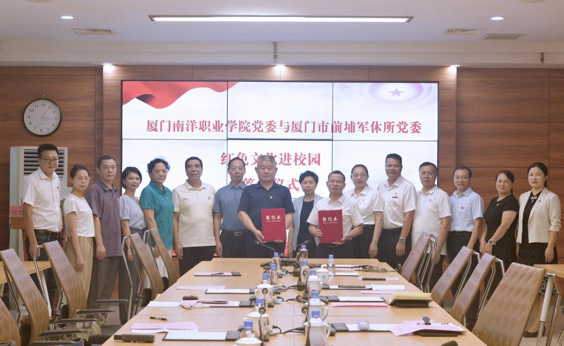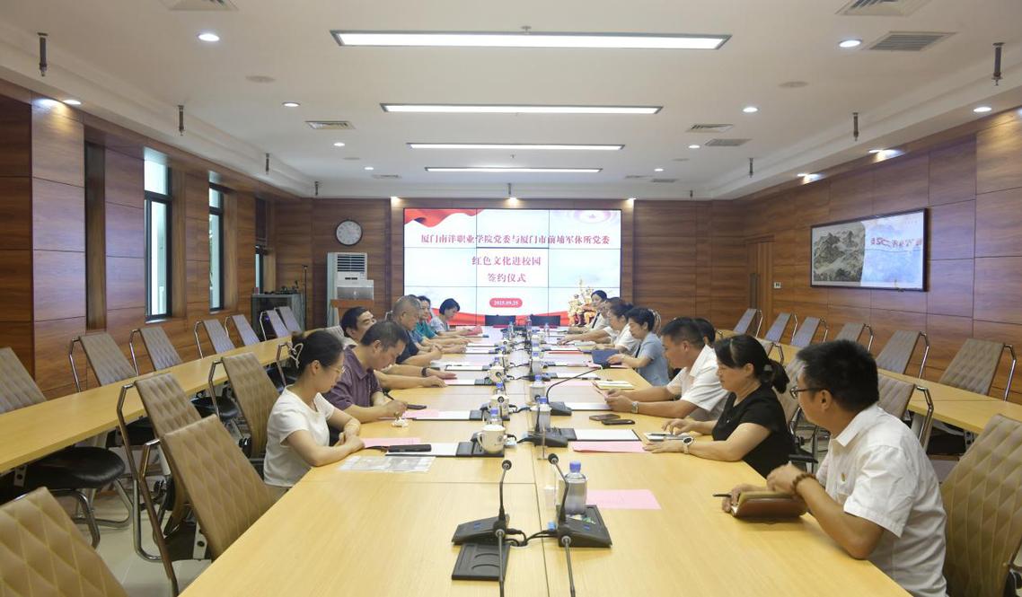 为深度融合红色资源与高校思政教育,协同培育时代新人,9月25日下午,我校党委与厦门市前埔军休所党委“红色文化进校园”签约仪式在第一会议室举行。厦门市前埔军休所副所长吴万庆、军休干部代表梁捷能、林村河、杜素琴、厦门市前埔军休所办公室主任曾剑、管理科科长胡舒婧、办公室科员潘妍,我校党委书记陈宏瑶,党委副书记、执行校长钟石根,党委群工委员、董事长鲁晓芹,党委副书记、副校长蓝德森,原副校长、校关工委副主任何卫华及相关职能处室负责人参加签约仪式。