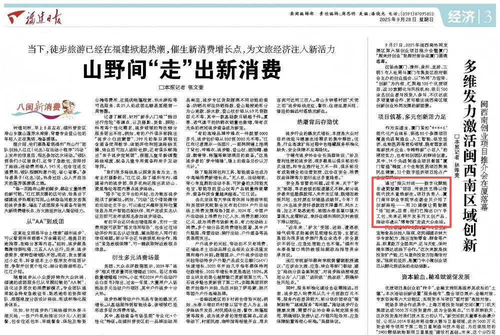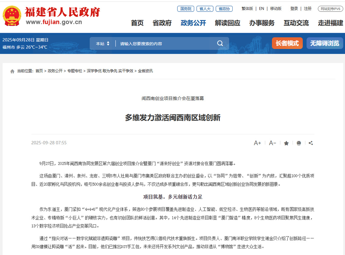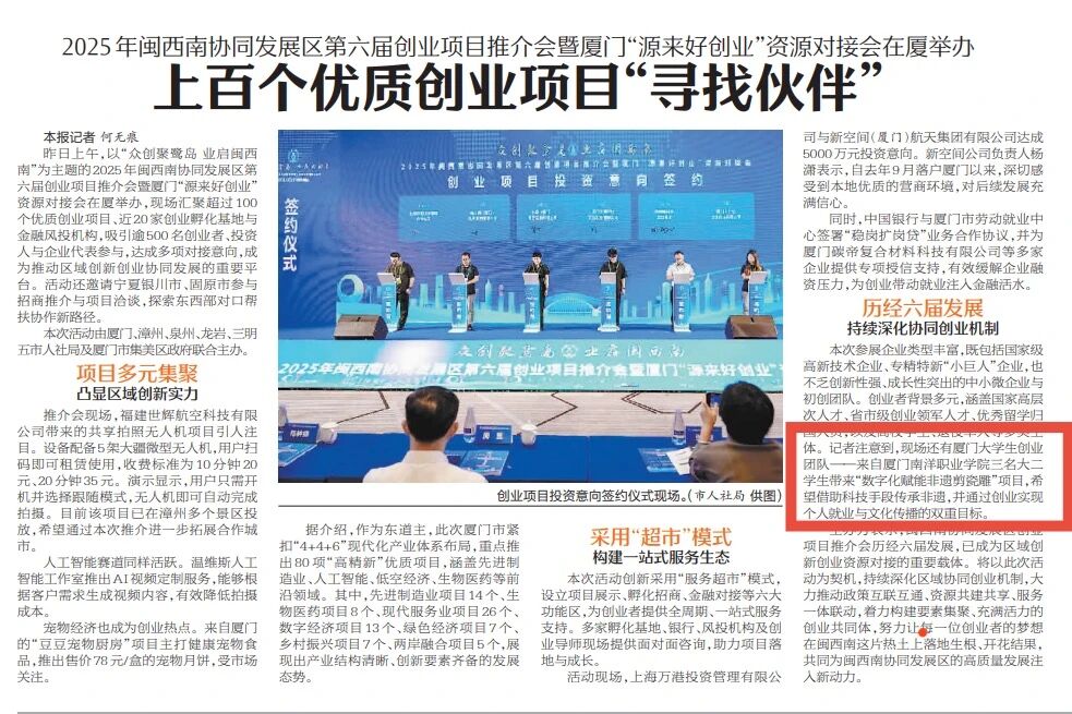9月27日,我校黄澄、林莉、冯蓓蓓、陈新艳、孙超(厦门大学)老师指导的《指尖对话-数字化赋能非遗剪瓷雕》创业项目代表厦门市亮相2025年闽西南协同发展区第六届创业项目推介会暨厦门“源来好创业”资源对接会。