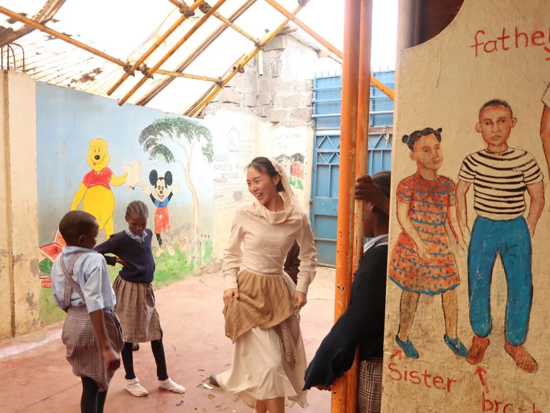 王今和内罗毕基贝拉贫民窟孩子们的第一次见面是在学校里。土墙围起来的不足70平的空间里,既是教室,也是操场。王今和当地学校负责人正在分发饼干,孩子们围着王今,眼神里带着点戒备和冷漠,看着眼前的陌生女人。
