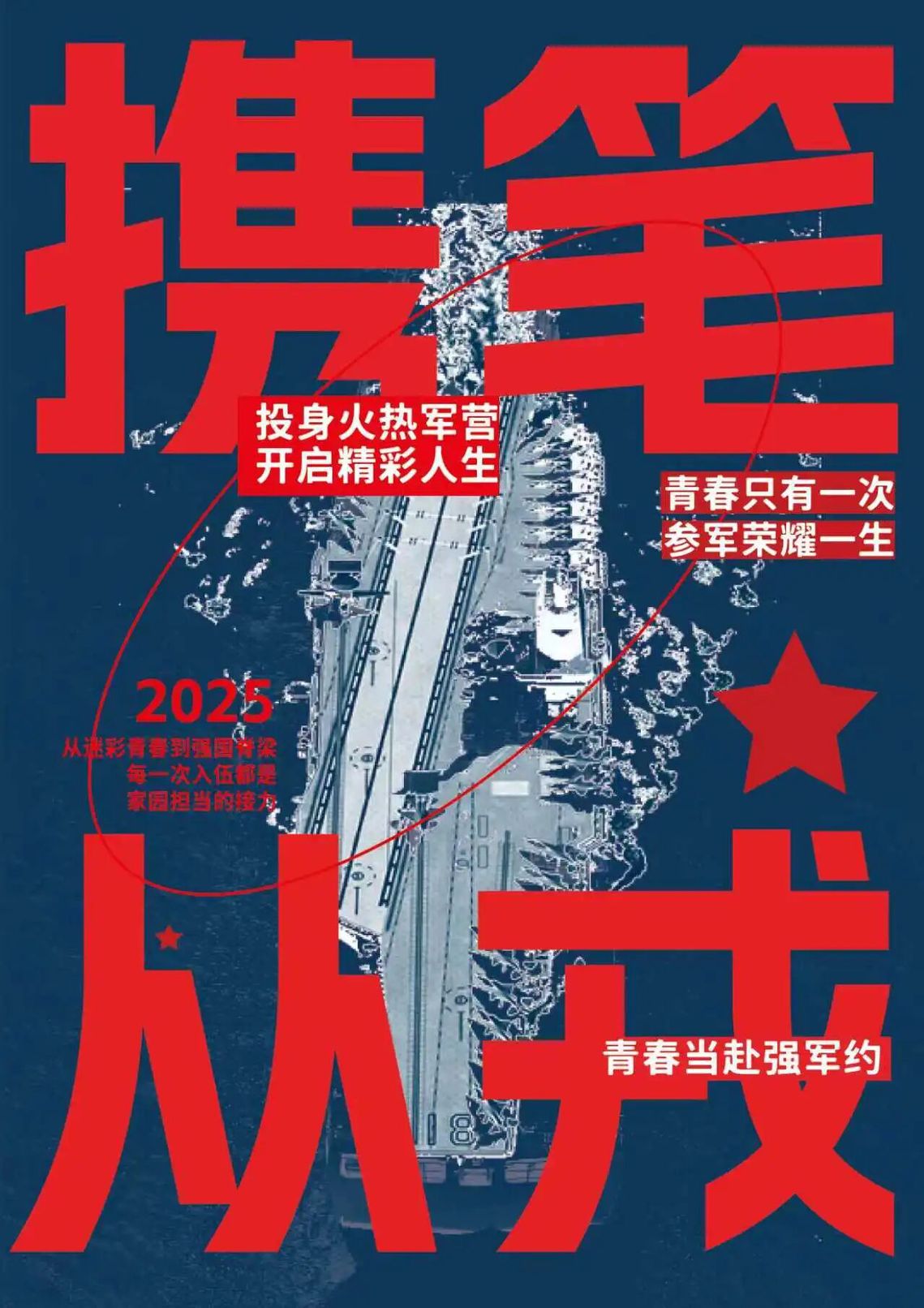 创作理念:本设计以炽烈的橙红色作为基调,象征军营的澎湃热血与青年投身报国的激情。文案“投身火热军营,开启精彩人生”强调参军是实现个人价值与家国担当的荣耀交汇点。“迷彩青春”与“强国脊梁”的意象层层递进,描绘了从淬炼自我到肩负使命的成长之路。“青春当赴强军约”将个人理想熔铸于新时代强军伟业,传递出使命在肩、不负韶华的磅礴力量,极具感召力。