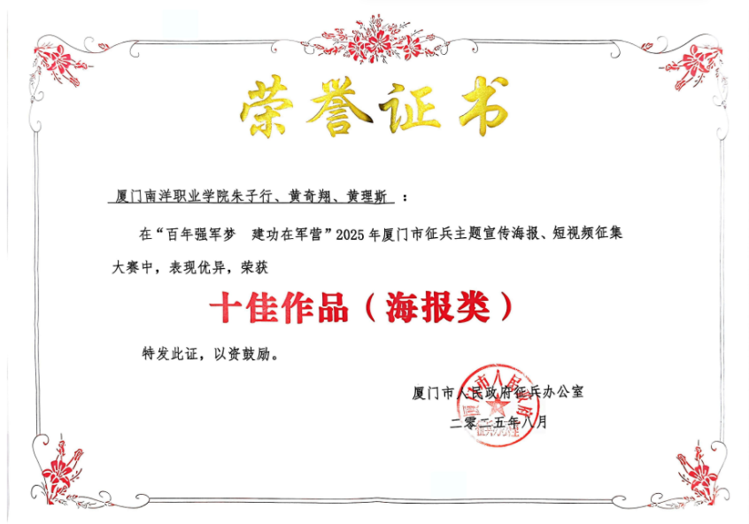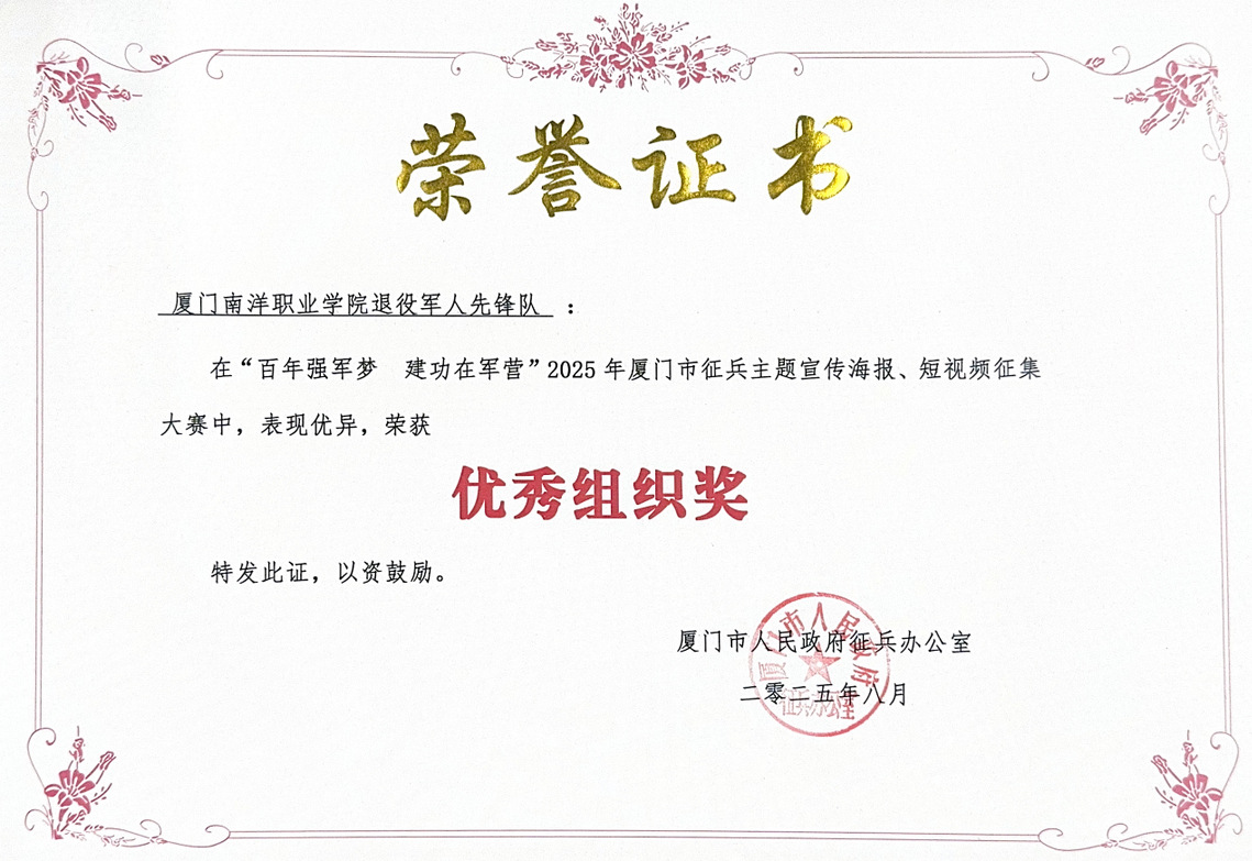 近日,由厦门市人民政府征兵办公室主办的“百年强军梦 建功在军营”2025年厦门市征兵主题宣传海报、短视频征集大赛圆满落幕,作品征集期间,共有近200份作品参赛,竞争十分激烈。我校退役军人先锋队斩获海报类十佳作品奖、视频类十佳作品奖和优秀组织奖三大奖项,实现奖项全包揽,充分展现了我校退役军人队伍的过硬素质与责任担当!
