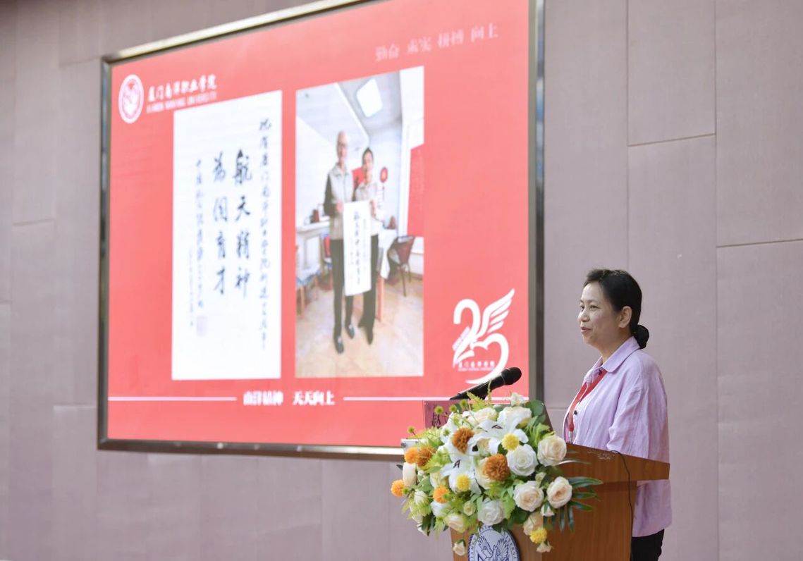 赵文波院士在作报告前,特别提到了她邀请百岁院士张履谦先生题词“航天精神 为国育才”,祝贺厦门南洋学院创建25周年。赵文波院士以《我国航天遥感领域发展阶段及现状与思考》为题,围绕我国遥感卫星及应用发展阶段分析及现状展开,指出遥感卫星应用工程是新质生产力的标配,并对国家航天领域的未来作出展望。最后,她呼吁更多优秀校友和科技创新企业参与国家航天事业,共同推动行业进步。