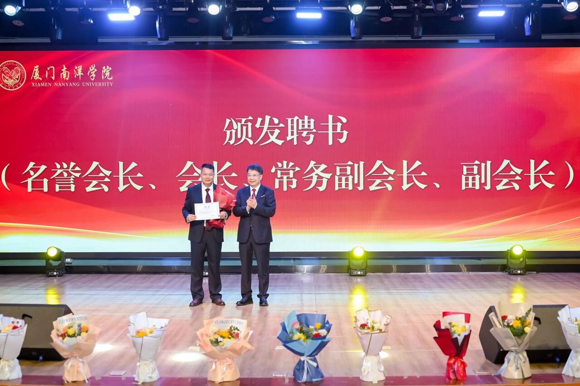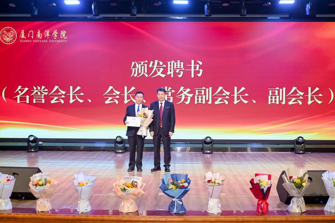 我校创办人、南洋教育投资董事长鲁加升教授为新一届名誉会长、会长、常务副会长颁发聘书,副校长蓝德森为新一届副会长颁发聘书。