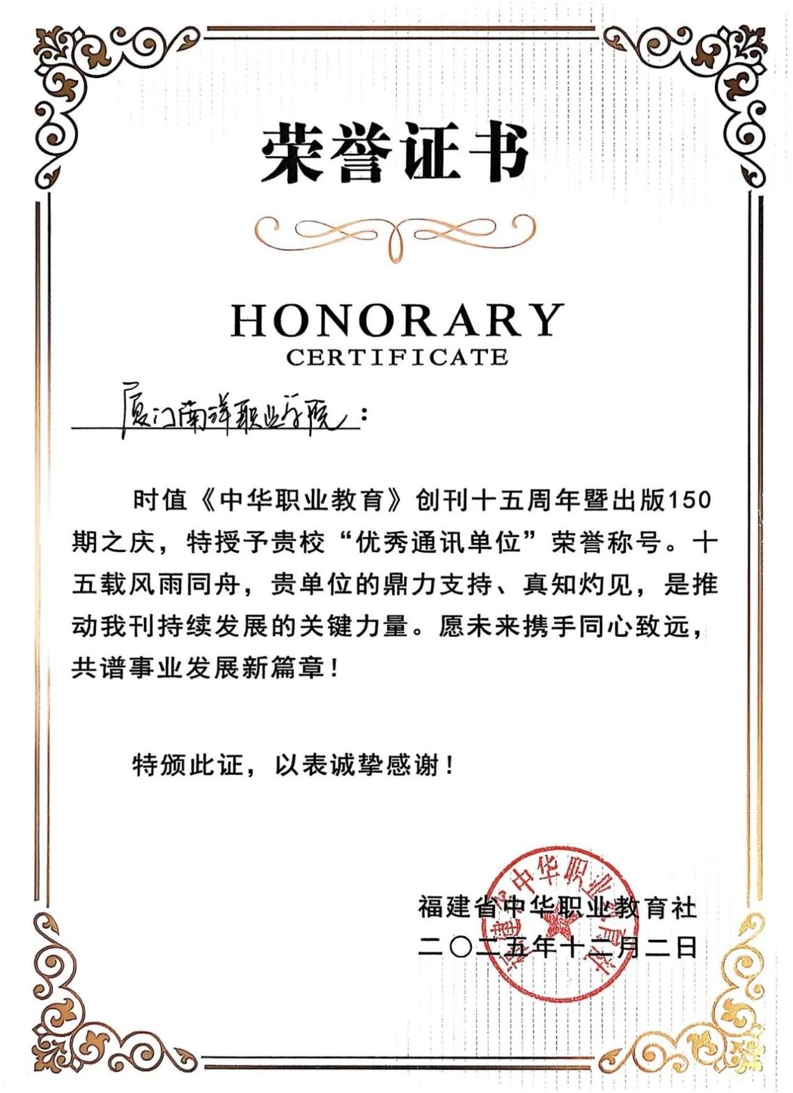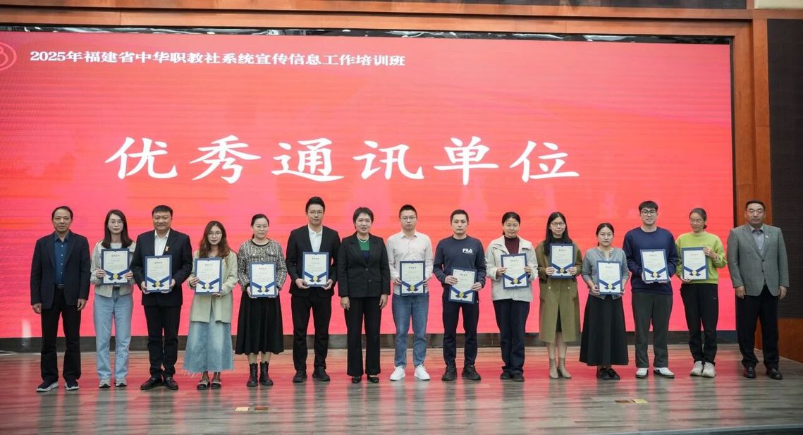 12月2日-4日,2025年福建省中华职教社系统举办宣传信息工作培训班。开班式上,省中华职教社表彰了“优秀通讯单位”“优秀通讯员”,我校获评“优秀通讯单位”荣誉称号!