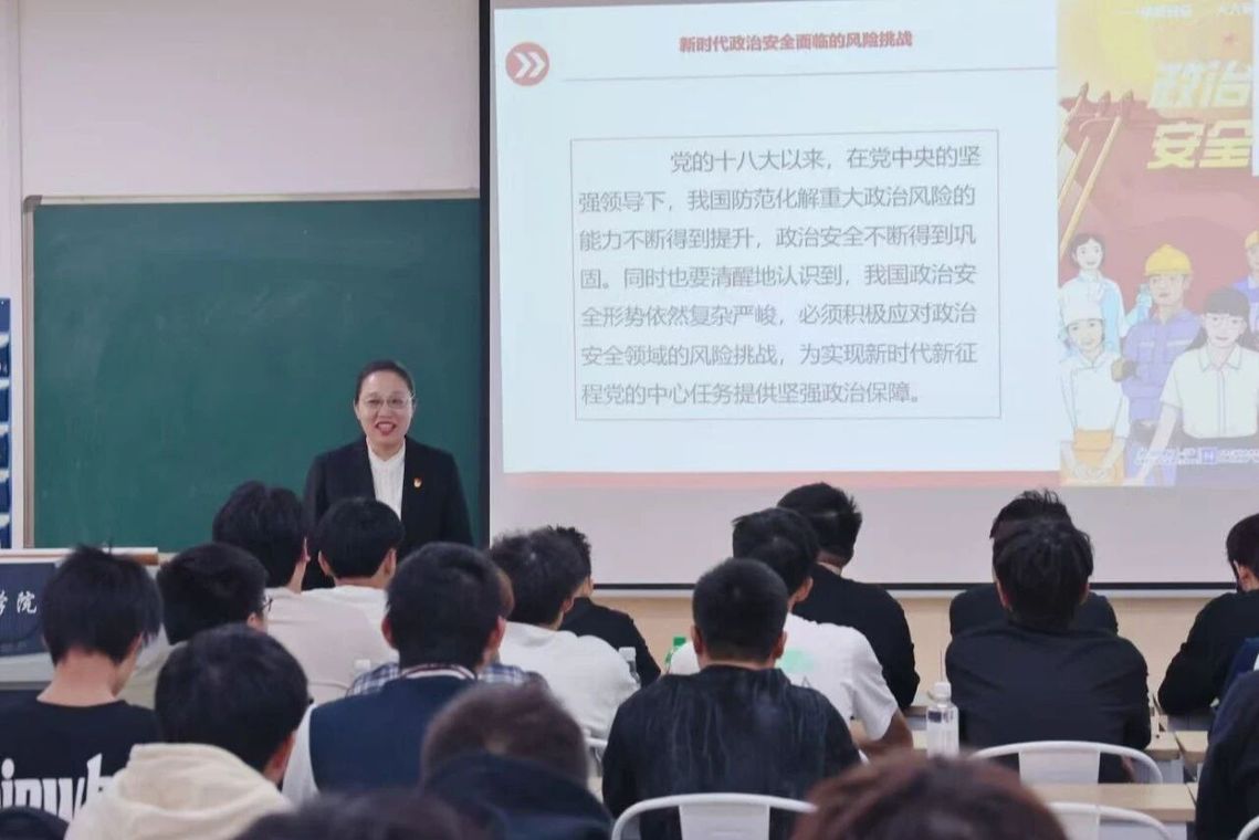 12月2日,党委委员、董事长鲁晓芹以《坚持以政治安全为根本》为题,为2025级电气自动化技术5班、2025级广告艺术设计1班学生上了一堂意义深刻的思政课。