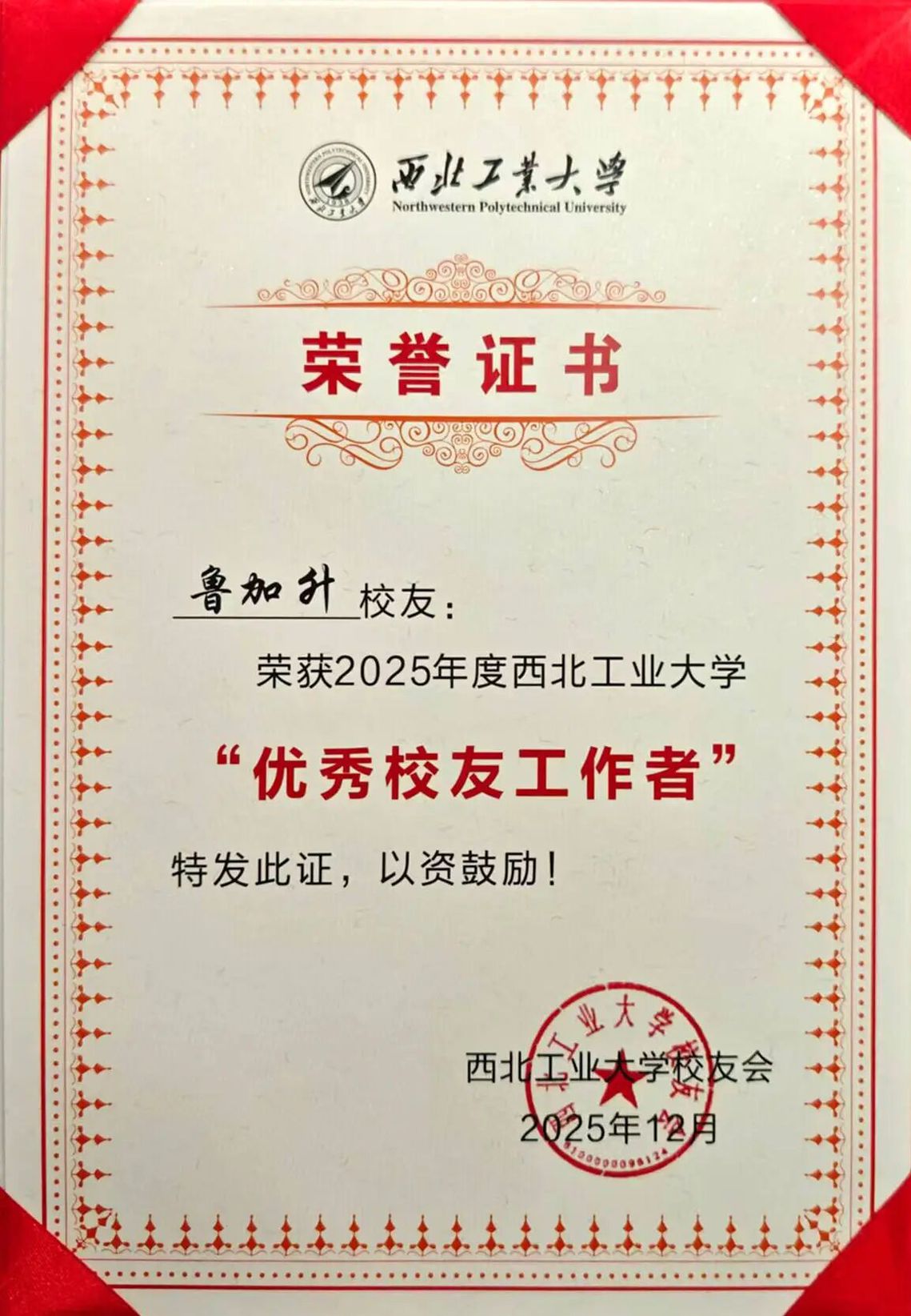 近日,我校创办人、西北工业大学厦门校友会会长鲁加升教授荣获母校西北工业大学授予的“优秀校友工作者”荣誉称号,以表彰其长期以来在联络服务校友、搭建校地合作桥梁、传承西工大精神等方面作出的突出贡献。