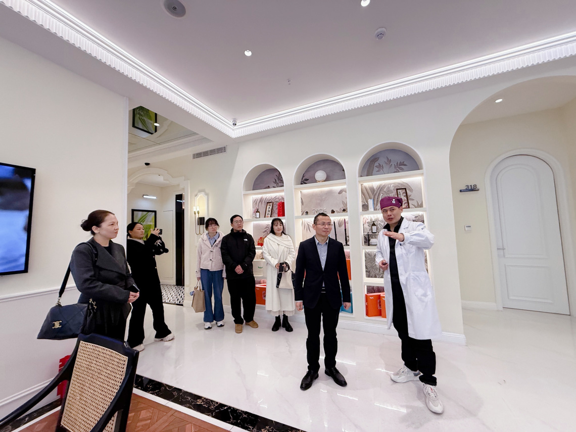 钟石根一行参观了医院检测区、手术区、护理区、服务区等核心功能区域。汪孟成介绍了微针植发诊疗全流程、核心技术应用要点及护理服务标准,让参访人员更直观掌握企业用人需求。