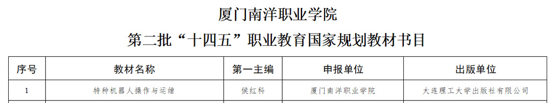 近日,教育部办公厅公布了第二批“十四五”职业教育国家规划教材书目,我校侯红科教授主编的教材《特种机器人操作与运维》入选。本次教材遴选在各省级教育行政部门、全国行业职业教育教学指导委员会、教育部职业院校教学(教育)指导委员会、教育部直属高校推荐的基础上,经形式审查、网络评议、会议评议、公示等程序,共确定2957种教材为第二批“十四五”职业教育国家规划教材。