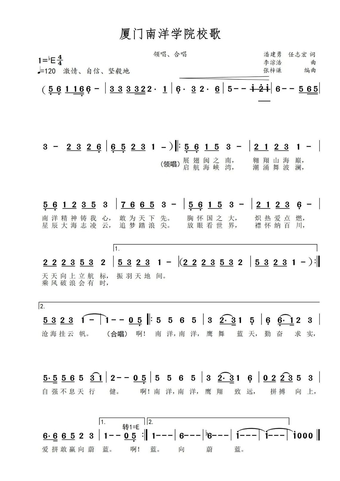 校歌旋律采用大调式、4/4拍、中速稍快构想,前奏承接耳熟能详,闽南特色鲜明之南洋学院“代校歌”《爱拼才会赢》旋律模进,意在产生代入感,形成旋律脉动,彰显南洋人自信、豪迈、朝气蓬勃、自强不息、爱拼敢赢、天天向上、逐梦未来的精气神。